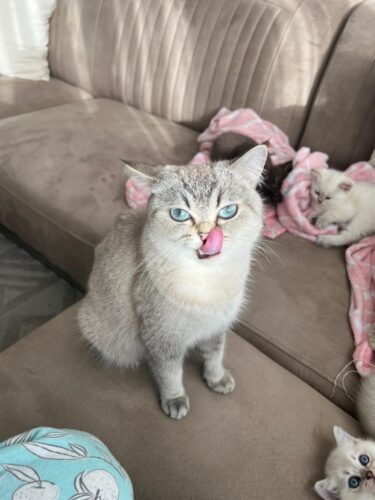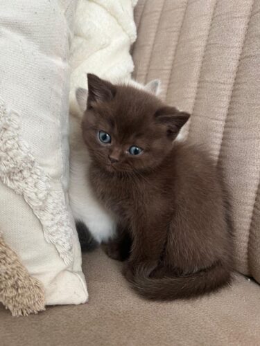 De mama poes is een Britse korthaar met blauwe ogen. Heeft een creme/grijze kleur. De papa heeft een goude kleur met groene ogen